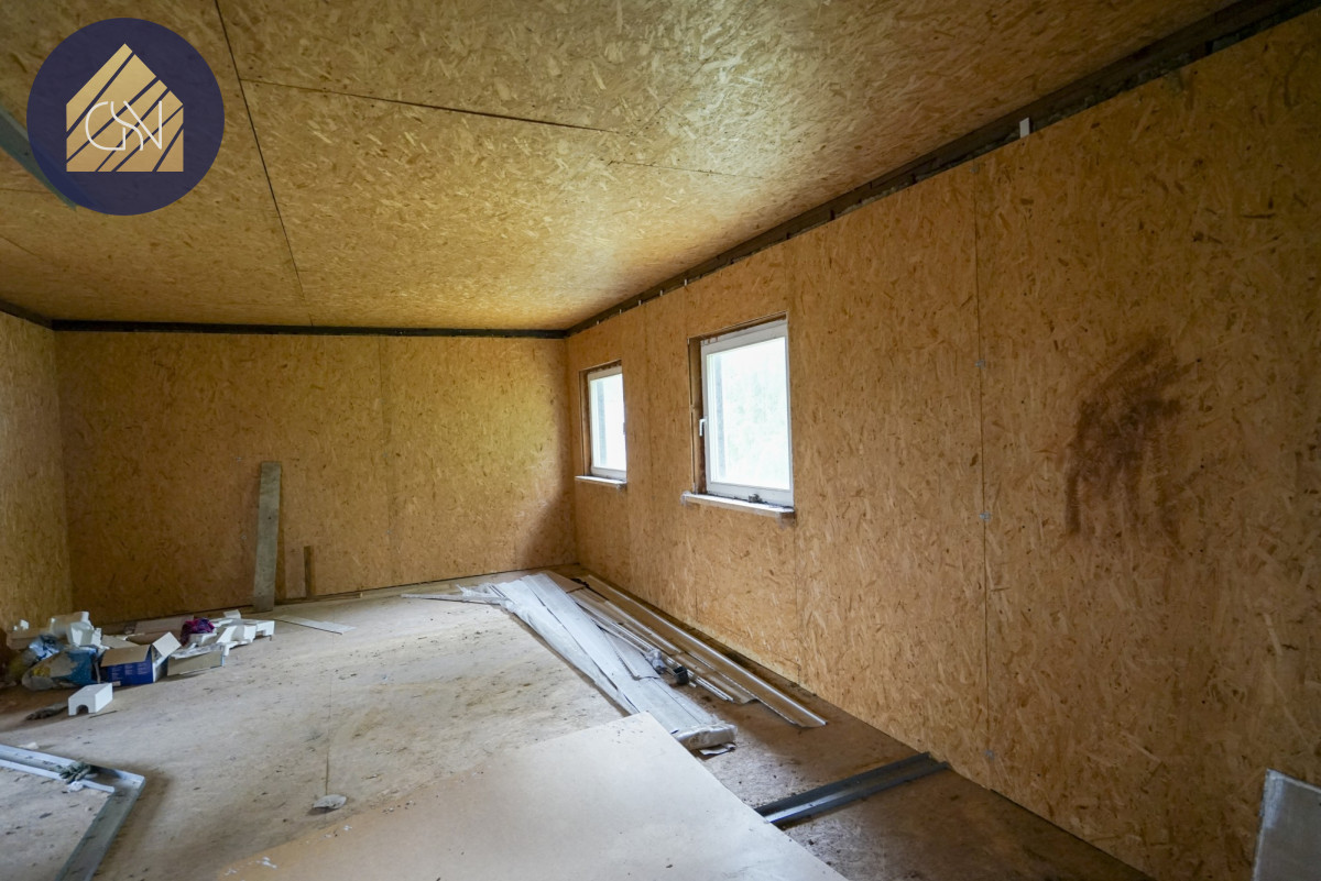 Na dziaÅ‚ce usytuowany jest budynek mieszkalny o powierzchni okoÅ‚o 170 m2, wybudowany w drugiej poÅ‚owie lat 90-tych w stanie surowym zamkniÄ™tym. Nie zostaÅ‚ oddany do użytkowania. Åšciany zewnÄ™trzne sÄ… konstrukcji drewnianej pokryte sidingiem.Â